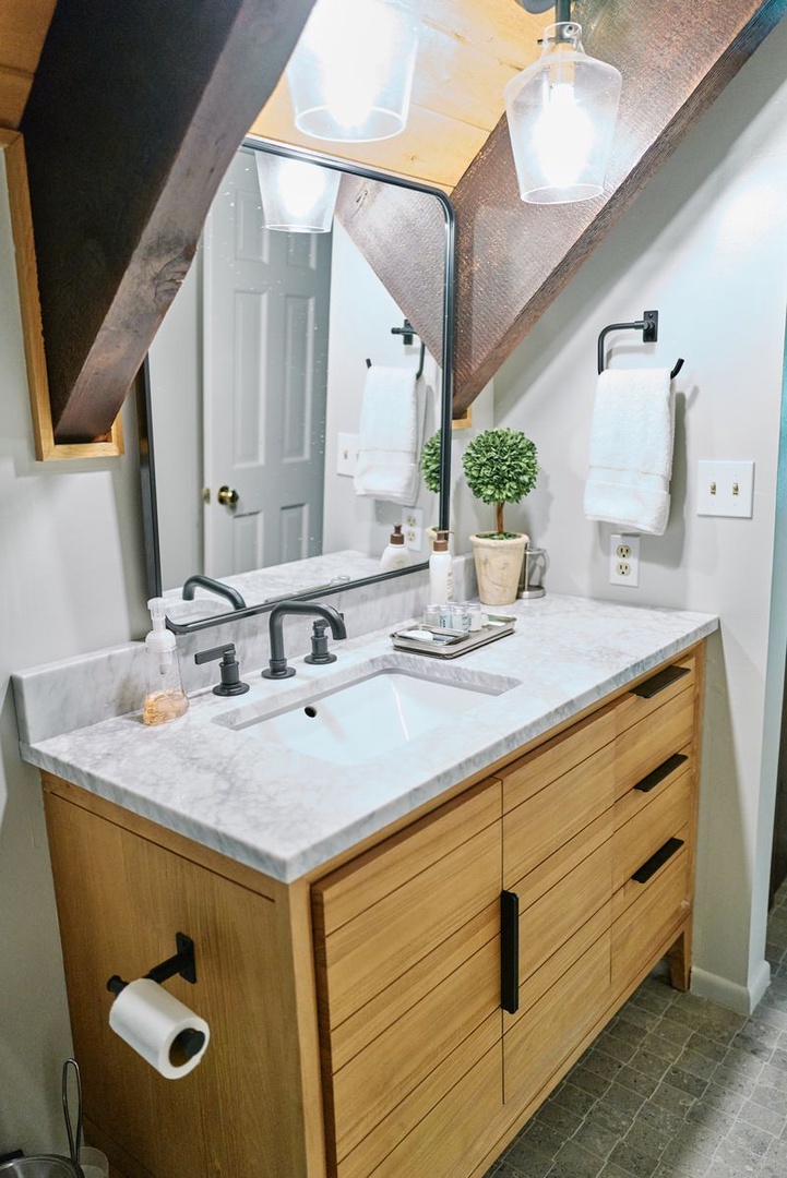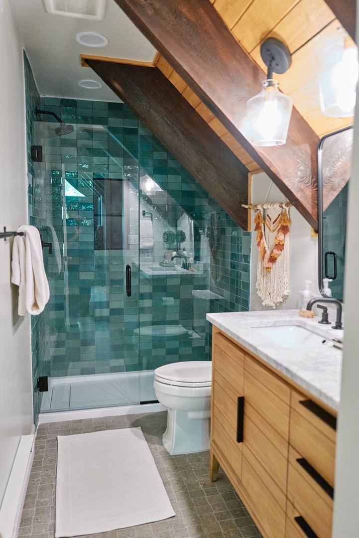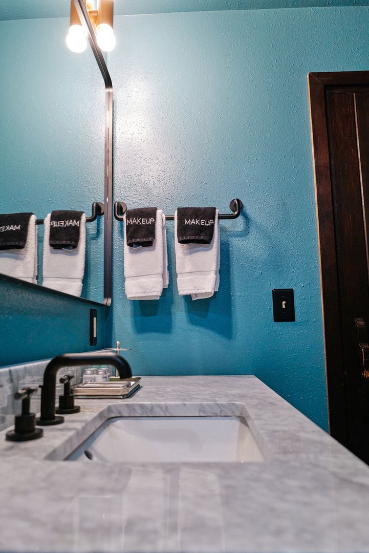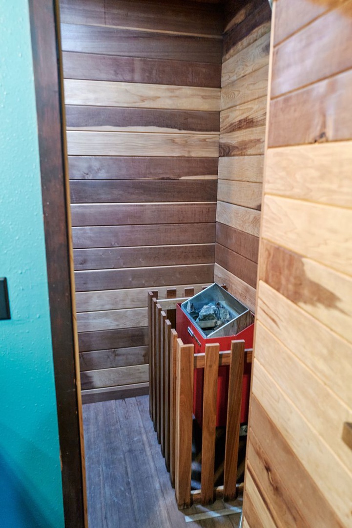 The 3rd level is dedicated to the primary bedroom, bath and large walk-in closet. It’s large, yet cozy suite, with exposed beams, a wood-burning fireplace and oversized picture windows that frame the aspen grove and mountains outside. It also has a large area that could be used as a private workspace, if needed.
